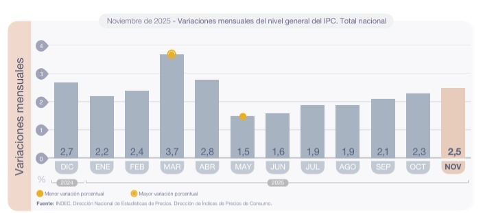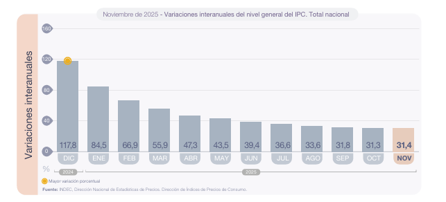 • En noviembre, la inflación interanual se ubicó en torno al 31,4%, con subas en vivienda, transporte y alimentos, mostrando que aún persisten tensiones de precios pese a la moderación en meses anteriores.